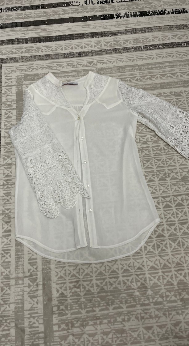 Pamuklu, uzun dantel kollu, V yaka, nakışlı desenli beyaz bol kesim bohem kadın gömleği. Günlük kullanım için uygundur.