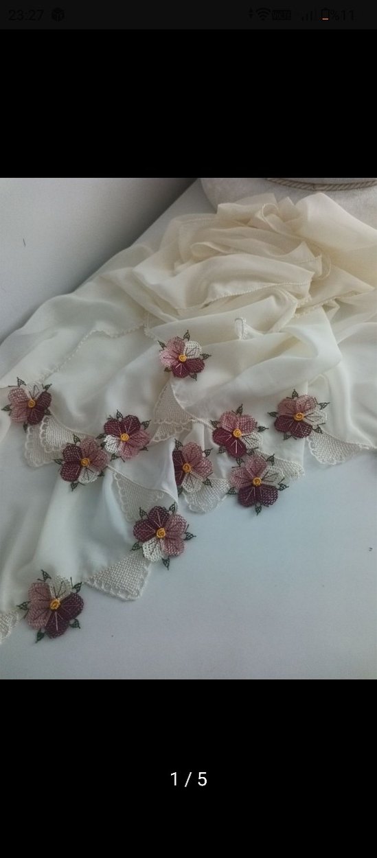 Beyaz tekstil şal, dantel kenarları ve zarif çiçek işlemeleriyle bohem ve retro tarzını yansıtıyor. Hippie moda tutkunları için uygun.
