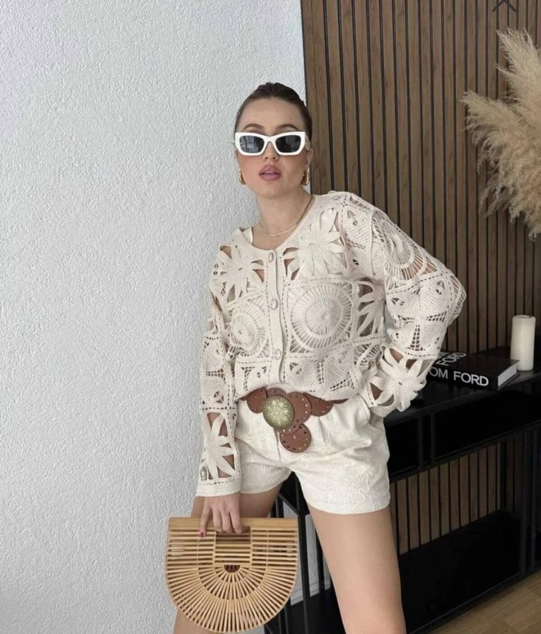 Dantel detaylı, etnik desenli beyaz bohem tarzı kısa tulum. Triko kumaştan, uzun kollu ve bol kesimdir, günlük kullanım için hafif ve rahattır.