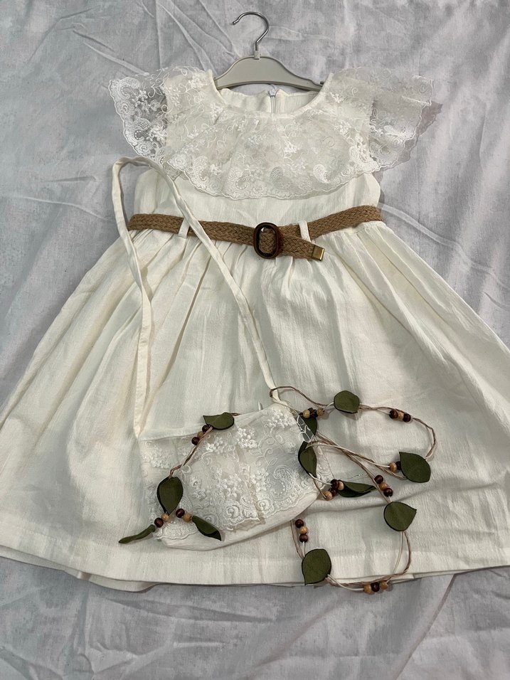 Dantel Detaylı Beyaz Bohem Kız Elbisesi ve çantalı