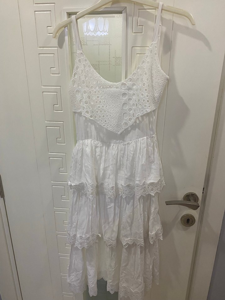 Pamuklu, dantel detaylı beyaz midi elbise. Kolsuz, straplez yaka ve işlemeli desene sahip, bohem tarzda, düğünler için uygun.