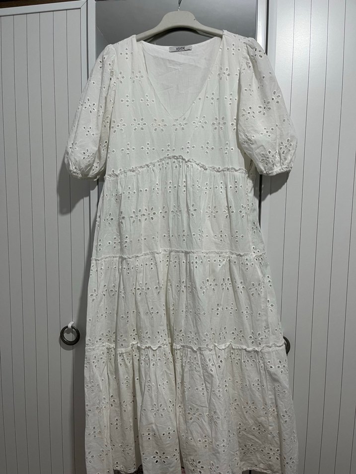 Pamuklu, V yaka ve kısa kabarık kollu beyaz midi elbise. Nakışlı dantel detayları ve bol kesimiyle bohem tarzda günlük kullanıma uygun bi kaç kere giyildi sıfır defo hasar kesinlikle yoktur
