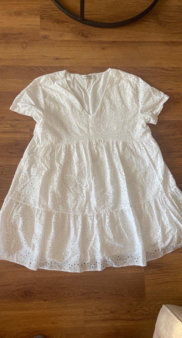 Kısa kollu, V yakalı beyaz midi elbise, dantel işlemeli ve pamuklu kumaştan. Bohem tarzı için bol kesimli ve rahat bir model. 1 kere tatilde giydim