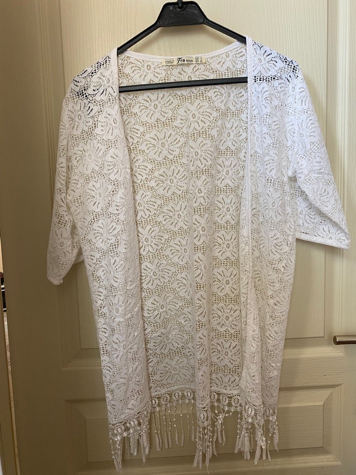 Nakışlı dantel detaylı, püsküllü beyaz bohem midi kimono. Kısa kollu, V yaka ve bol kesim rahat kullanım sağlar.