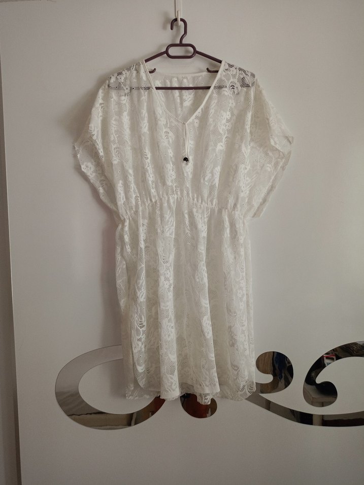 Dantel detaylı, V yaka ve kısa kollu beyaz tunik. Hafif keten kumaştan, bol kesim ve midi boy, bohem tarz için uygundur.