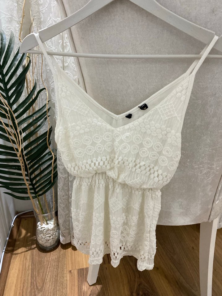 Dantel nakışlı, pamuklu beyaz askılı V yaka üst. Bohem tarzda, bol kesim ve kısa boyda, günlük kullanım için uygundur.