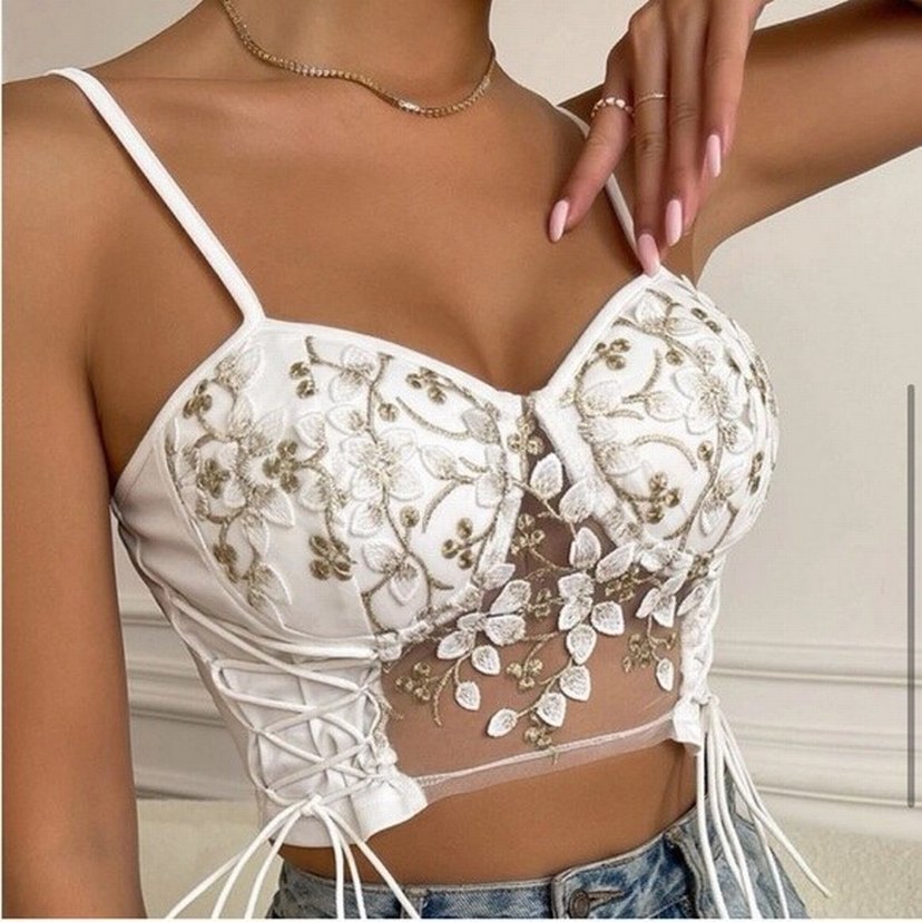 Dantel işlemeli beyaz, kısa ve fitted kesim bohem tarzı büstiyer. İp detayları ve straplez yakası ile şık bir seçim.