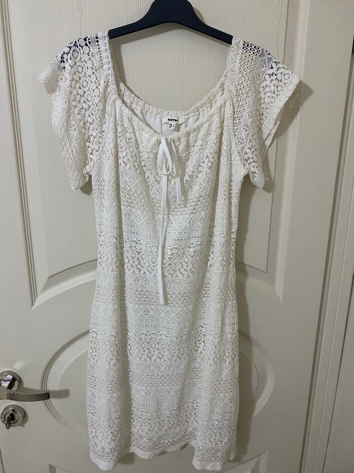 Dantel detaylı ve nakışlı desenlere sahip beyaz örgü elbise. Kısa kollu, kayık yaka ve bol kesim bohem tarzda.