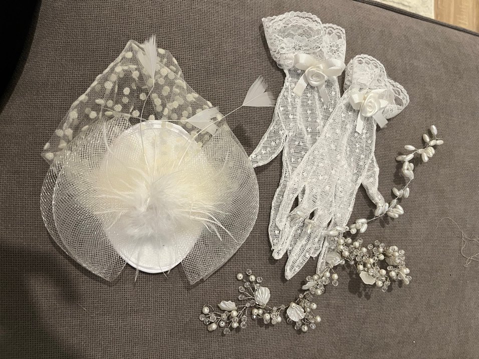 İnce tüyler ve inci detaylarıyla beyaz dantel nikah aksesuarları, bohem tarzda ve modaya uygun tasarım sunar. Eldivenler hiç kullanılmadı şapka aksesuarı da bir kez kullanıldı ürünü alana son iki görseldeki saç aksesuarlarını hediye edeceğim.