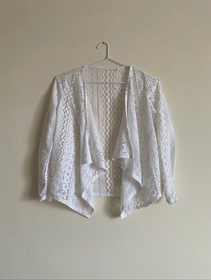 Dantel detaylı, uzun kollu, notched lapel yakalı beyaz, bol kesim hırka. Hafif ve nefes alabilen keten kumaştan yapılmıştır, bohem tarzına uygundur. Günlük kullanıma uygundur.