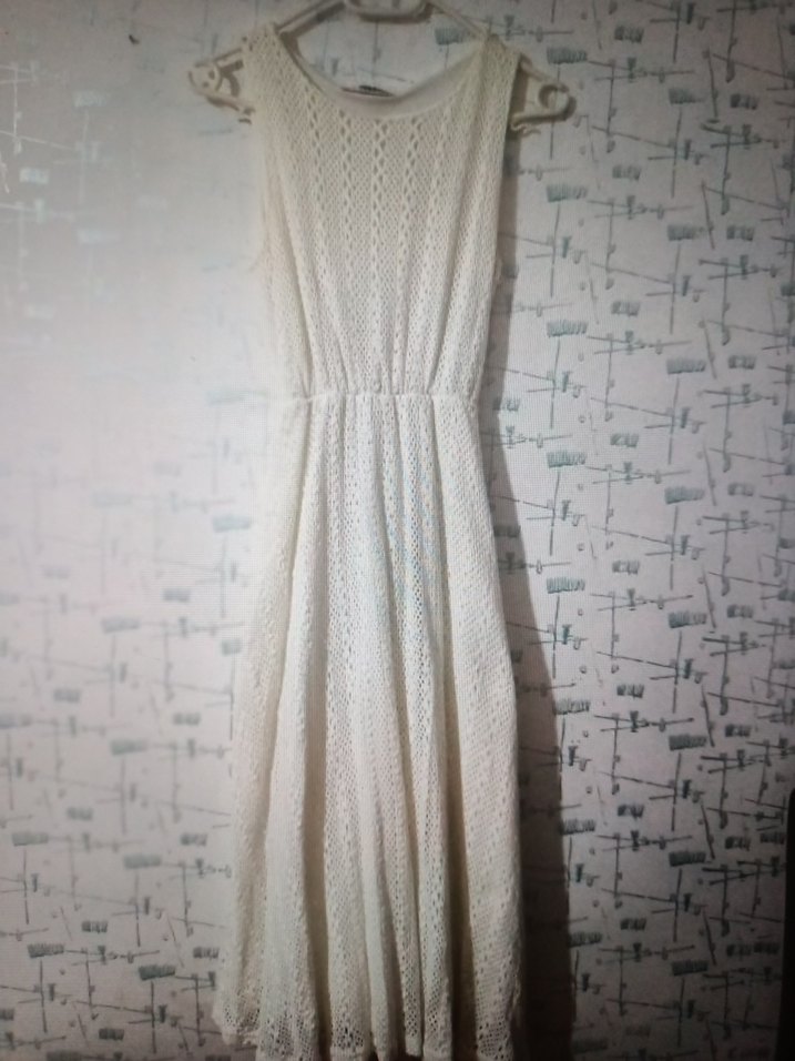 Dantel detaylı, yuvarlak yakalı, kolsuz beyaz uzun elbise. Bohem tarzı ve rahat kesimlidir.