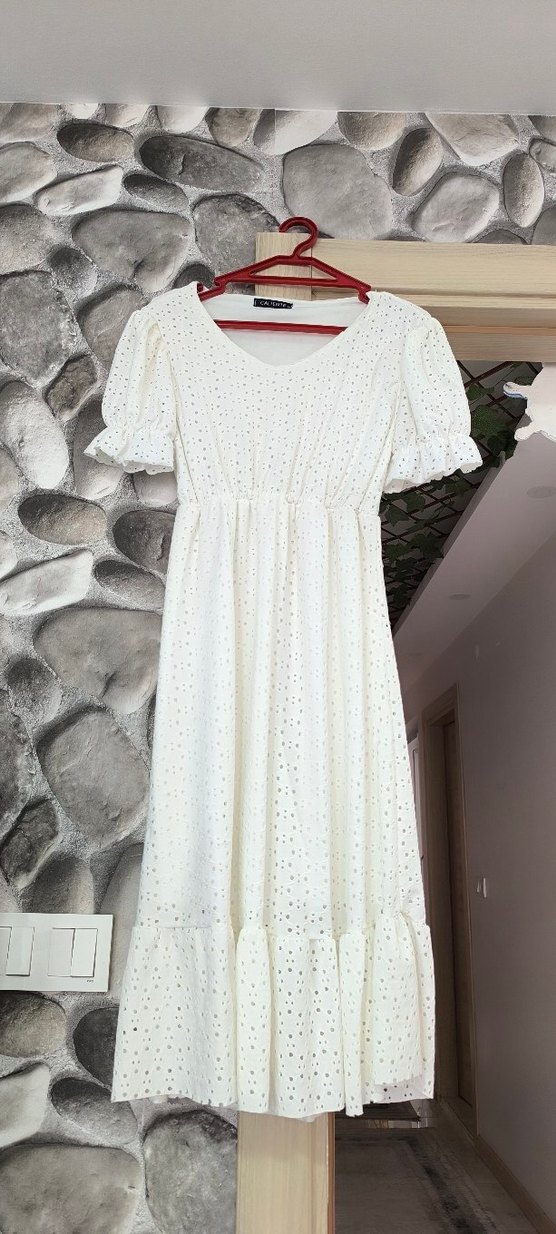 Pamuk kumaştan yapılmış, dantel ve nakış detaylı, bol kesim beyaz uzun elbise. V yaka ve kısa kabarık kollarıyla bohem tarzı yansıtır, düğün için uygundur.
