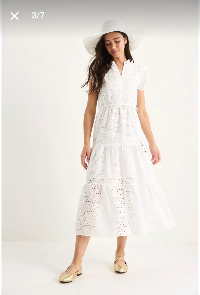 Pamuk kumaştan, nakışlı dantel detaylı, kısa kollu, V yakalı, bol kesim beyaz uzun elbise. Günlük kullanıma uygun. 1 kere evde giyildi sıfırdan farkı yoktur 165 boy 58 kiloyum 90 beden göğüs tam oldu