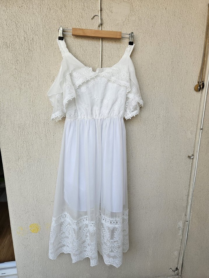 Dantel detaylı beyaz uzun elbise, straplez yakalı ve bol kesim. Nakışlı desen ve örme kumaş bohem tarzı sunar, düğünler için uygun.