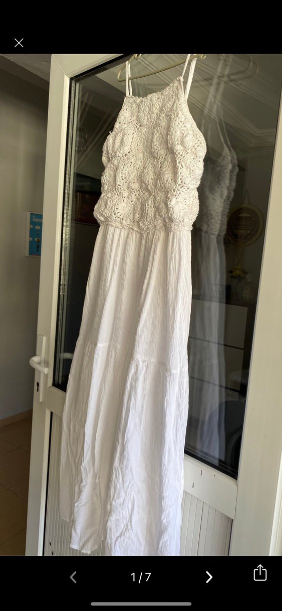 Dantel detaylı, askısız ve kolsuz beyaz bohem uzun elbise. Yumuşak keten kumaştan, bol kesim ve düğün için uygun.