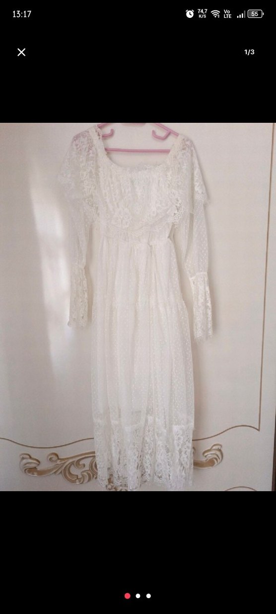 Yumuşak keten kumaştan, dantel detaylı, bol kesim, uzun kollu ve tekne yaka beyaz uzun elbise. Bohem düğünler için uygun.