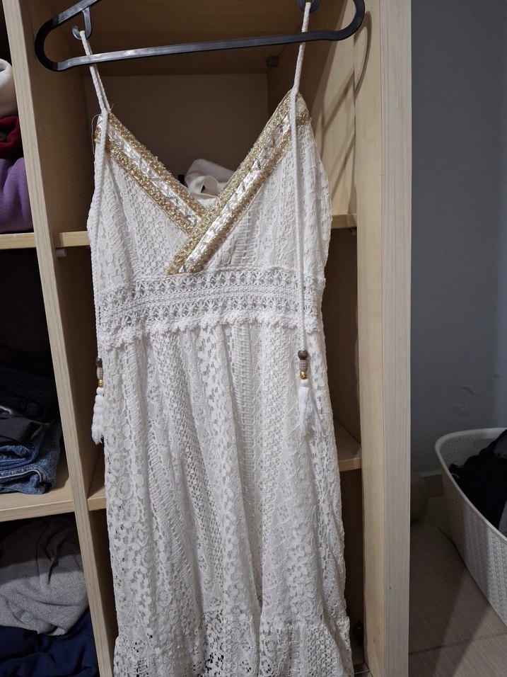 V yaka, askılı ve işlemeli desenlere sahip beyaz kısa elbise. Dantel detayları ve bol kesimiyle günlük kullanıma uygun bohem tarz elbise. Diz hizasında. Hiç kullanılmadı.