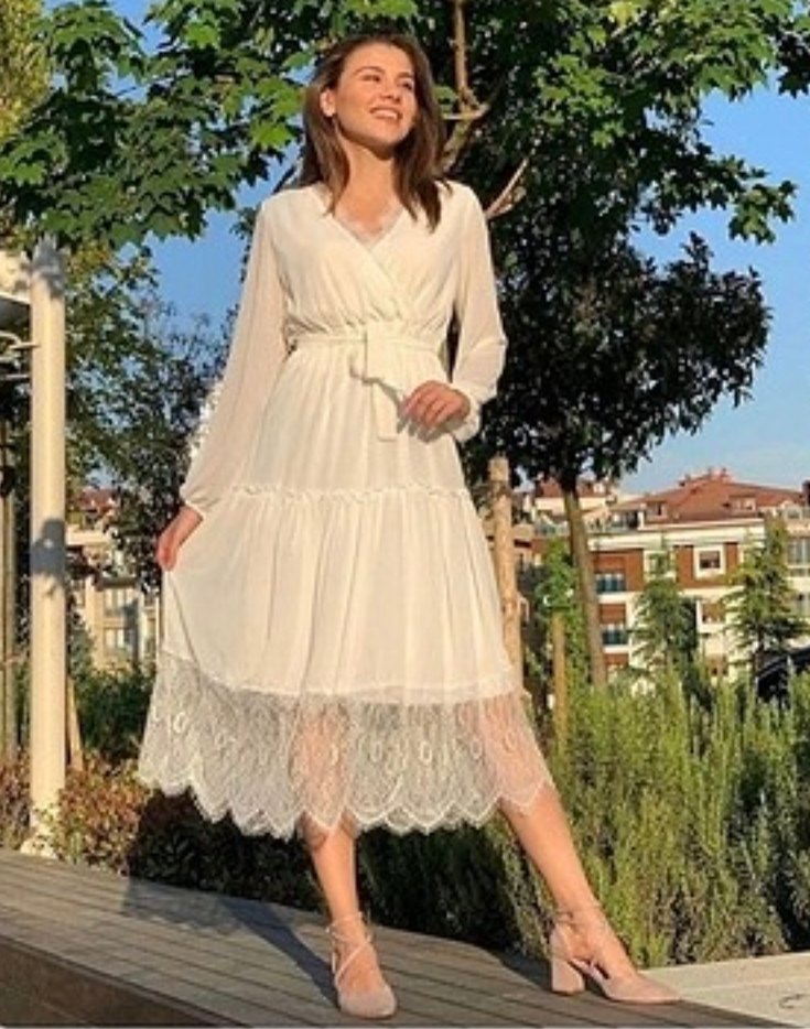 Dantel Detaylı Beyaz Bohem Uzun Elbise
