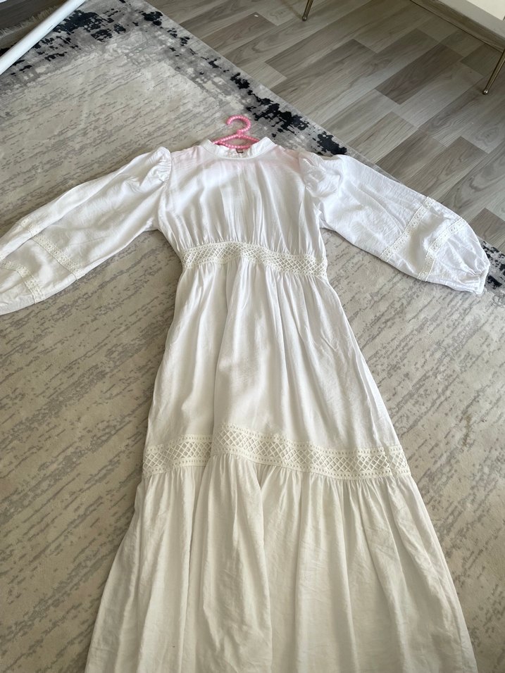Dantel Detaylı Beyaz Bohem Uzun Keten Elbise