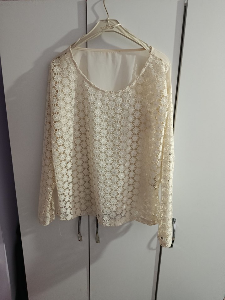Dantel detaylı, beyaz örme kumaştan, uzun kollu ve yuvarlak yakalı, midi boy bohem tarzda bol kesim bluz.kendim yırtmaç açmıştım dikiş yerlerinden fotoğrafta görünmektedir. istenirse eski haline getirilir.