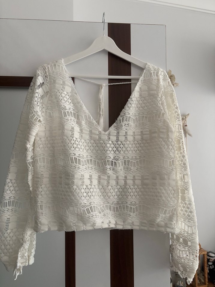 Beyaz renkli, V yakalı, dantel detaylı, bohem tarzda örme kumaştan bluz. Salaş kesim ve uzun kollarıyla midi boyda, günlük kullanıma uygun.