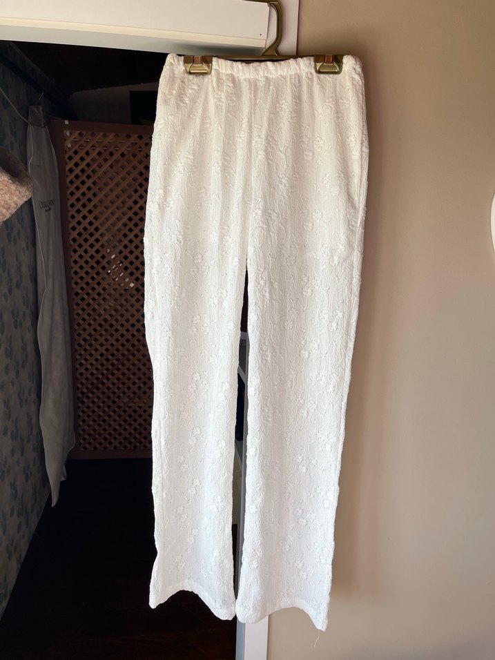 Dantel detaylı, bol kesim uzun beyaz keten pantolon. Bohem tarzda, günlük kullanıma uygun rahat ve hafif.