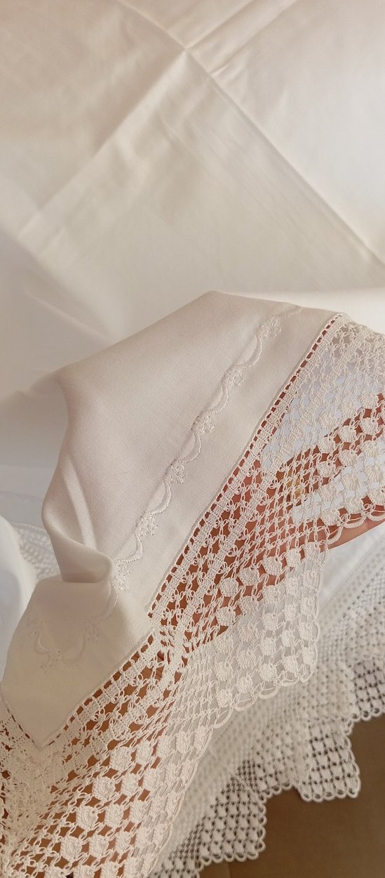 yumuşak beyaz kumaş üzerinde ince dantel detaylarıyla vintage ve klasik bir görünüm sunar. Hafif ve zarif bir dokunuş katmak için ideal. çift kişiliktir pamuklu üç tarafı el örmesidir dantelli çarşaf sıfırdır
