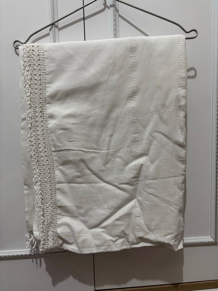 beyaz çarşaf, kenarında ince dantel detaylarıyla sade bir şıklık sunar. ️tek kişilik , bazı yerlerinde delik var