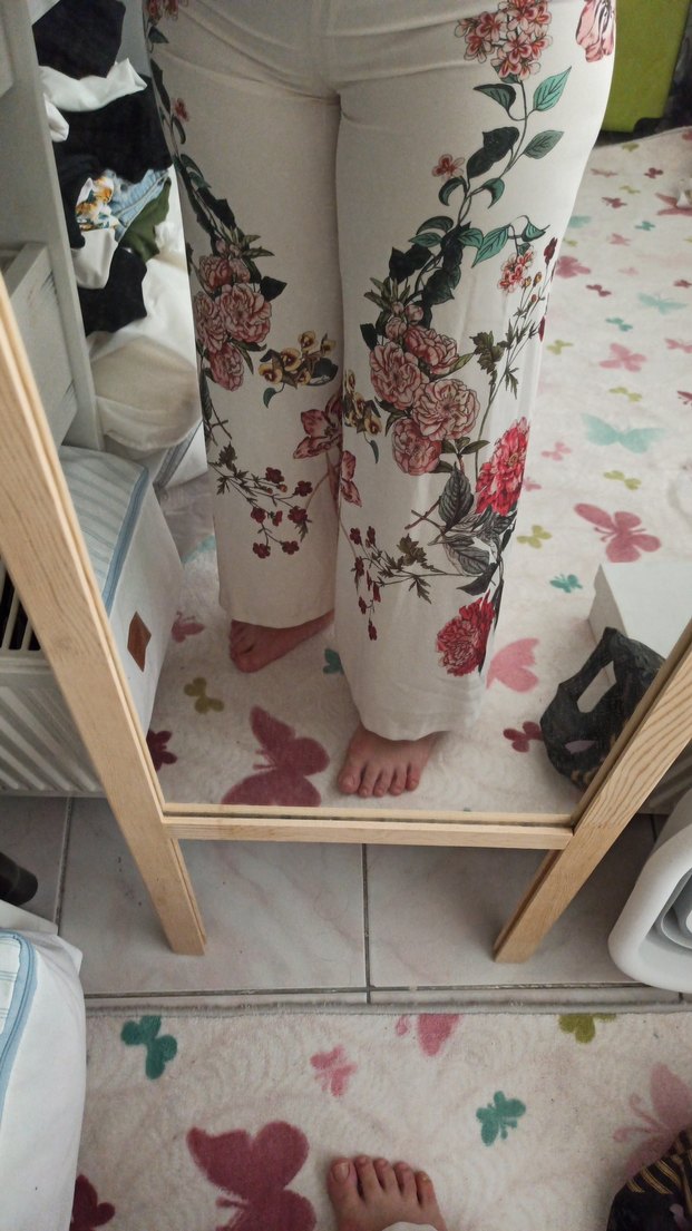 Dantel detaylı, beyaz kumaştan, çiçek desenli, bol kesim bohem tarzı pantolon, günlük kullanım için uygundur.