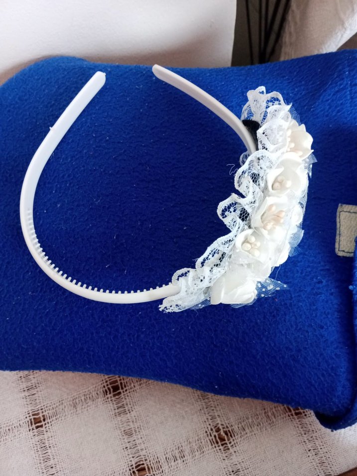 Dantel ve nakışlı çiçek detaylarıyla beyaz çocuk taç, zarif ve vintage bir görünüme sahip. Çok temiz az kullanilmis