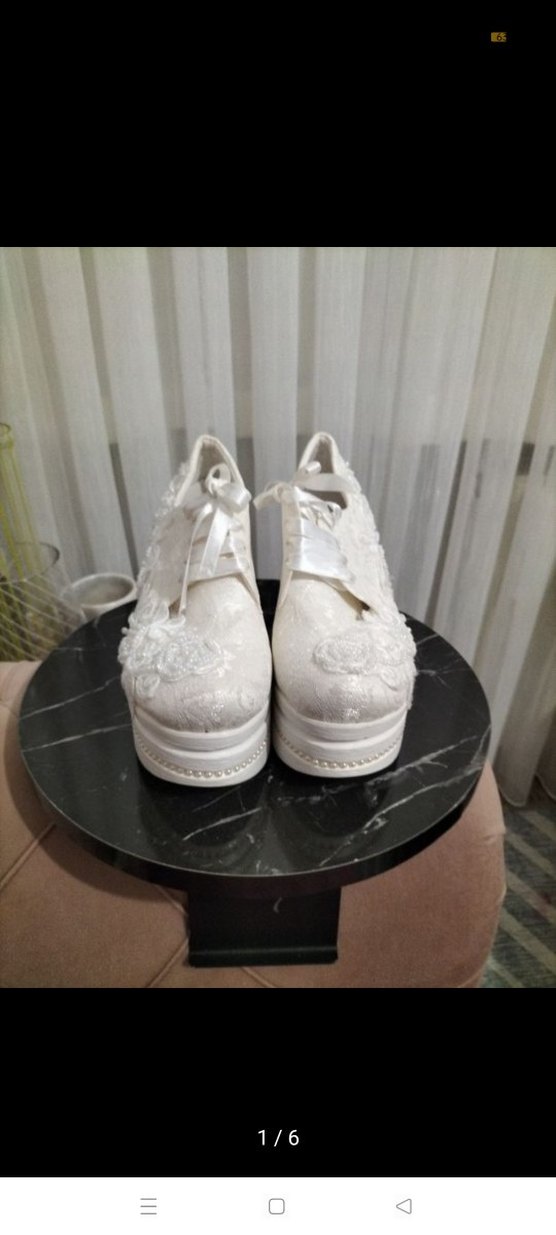 Dantel ve nakış detaylı beyaz dolgu topuklu kadın spor ayakkabısı, klasik Paris tarzı ile düğünler için uygundur. Tabanı kauçuktur.