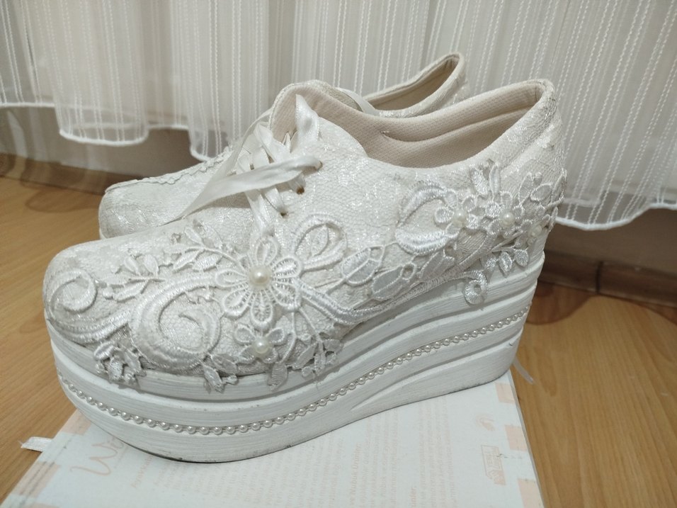 Beyaz dolgu topuklu kadın spor ayakkabı, işlemeli dantel ve inci detaylarına sahip, sentetik kumaştan, klasik ve vintage tarz için uygun.