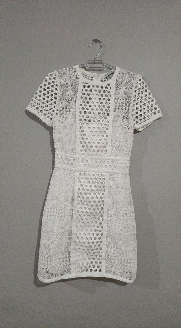 Dantel ve nakış detaylı, kısa kollu, beyaz elbise. Vücuda oturan kesimi ve yuvarlak yakasıyla günlük kullanıma uygundur. Elbisenin boyu 85 cmdir.