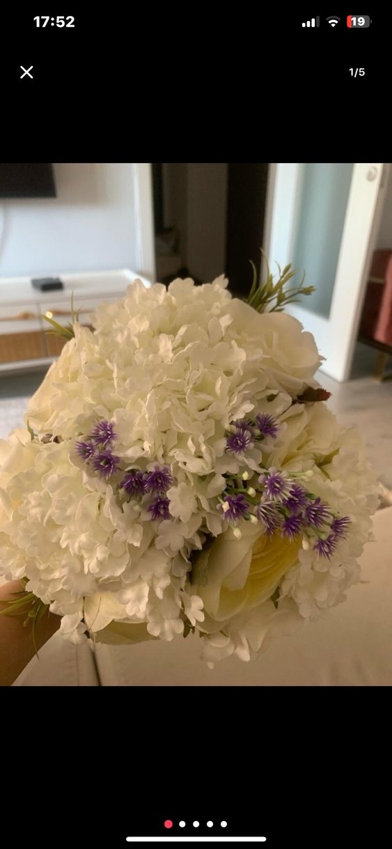Dantel detaylı beyaz gelin buketi, açık mor vurgularla klasik ve minimalist bohem tarzını yansıtıyor.
