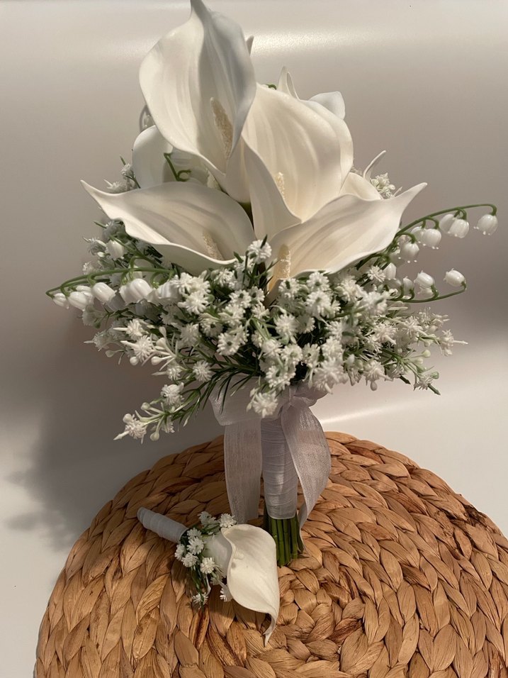 Dantel detaylı beyaz gelin buketi ve yaka çiçeği, modern klasik tarzda zarif zambaklar ve küçük çiçeklerle sade ve şık bir görünüm sunar. El yapımıdır, istenilen şekilde yapılır. Görsel paylaşıldığı takdirde de yapılabilir