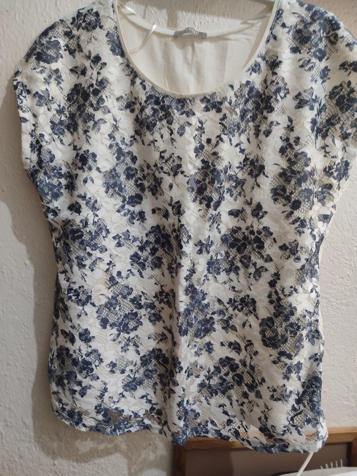 Yuvarlak yaka ve kısa kollu kadın bluz, beyaz ve gri renklerde çiçekli desenli ve dantel detaylıdır. Salaş kesimiyle bohem Paris tarzını yansıtır.