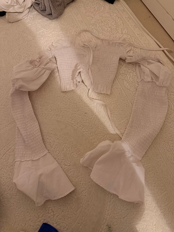 Dantel detaylı, keten kumaştan beyaz, halter yaka ve ince askılı, vücuda oturan bluz. Uzun, hafif volanlı kollar ve midi boy ile bohem tarzda.