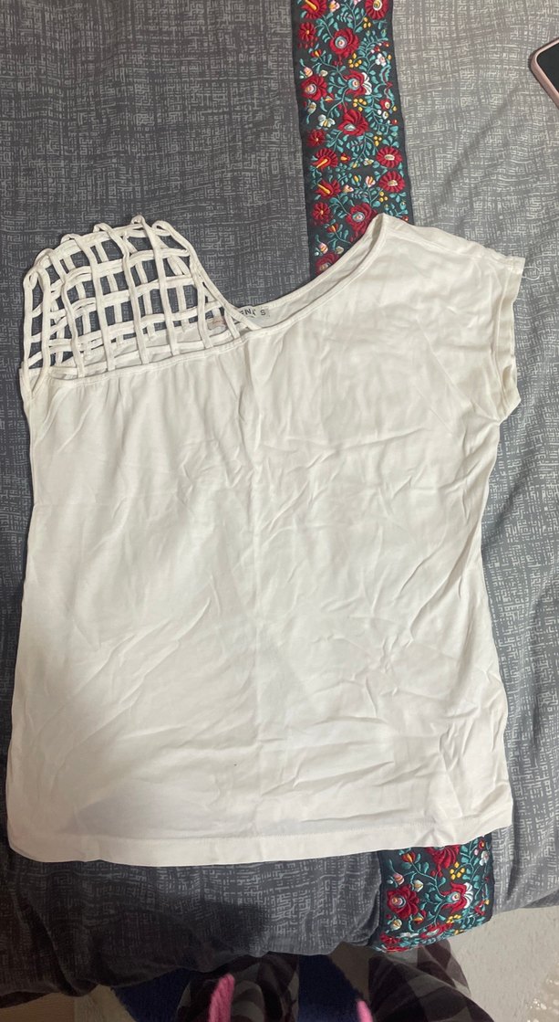 Dantel detaylı, tek omuzda şık desenli beyaz hamile atlet. Pamuklu, hafif ve vücuda oturan midi boy tasarım, günlük kullanıma uygun.