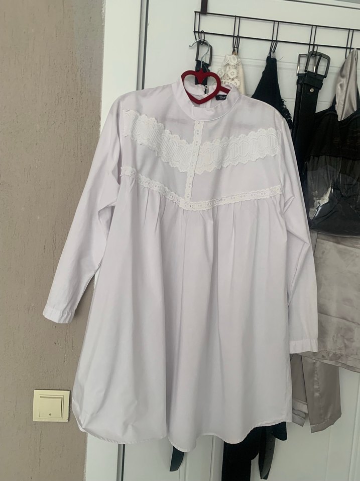 Pamuklu, dantel detaylı, uzun kollu ve yüksek yakalı beyaz hamile bluzu. Rahat kesimiyle günlük kullanım için uygundur.