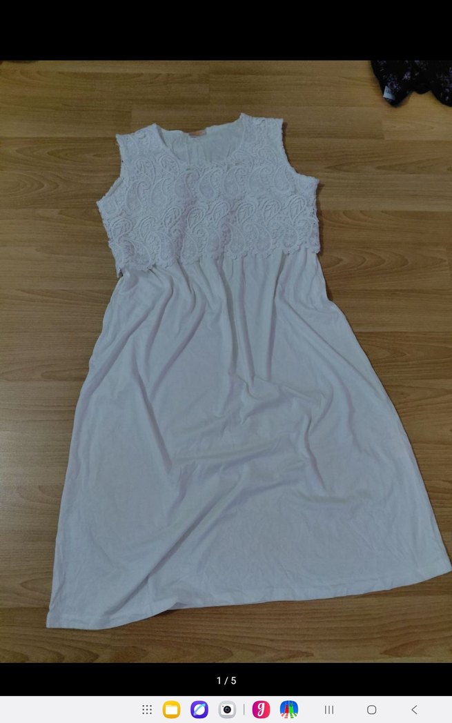 Üst kısmı dantel detaylı, v yaka, kolsuz beyaz hamile geceliği, midi boy ve bol kesimdir. Rahat kullanım sağlar.