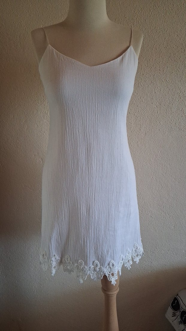 Dantel detaylı, askısız beyaz hamile tunik. Yumuşak keten kumaştan, bol kesim ve midi boyda, günlük kullanım için uygundur.