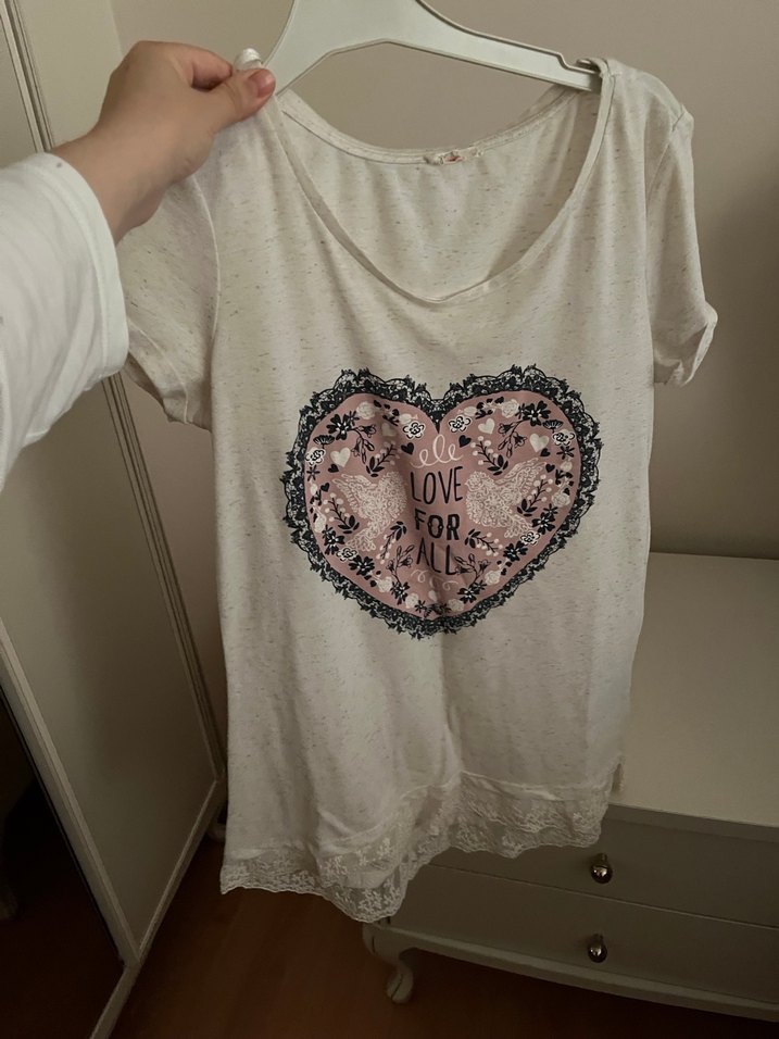 Pamuk kumaştan, dantel detaylı, kısa kollu, yuvarlak yakalı, bol kesim beyaz hamile tişörtü. Üzerinde kalp desenli baskı bulunur.
