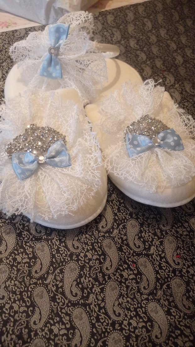 Klasik tarzda beyaz örgü ayakkabılar, dantel ve nakış detaylı, açık mavi puantiyeli fiyonk ve parlak taşlarla süslenmiştir.