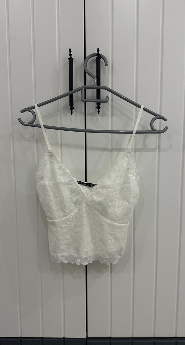 İnce askılı, V yakalı, dantel detaylı beyaz mini büstiyer, yumuşak sentetik kumaştan, günlük kullanım için uygundur.