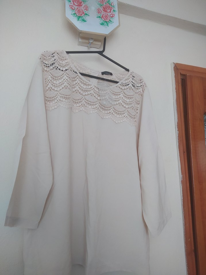 Beyaz renkli, dantel detaylı, kayık yaka ve uzun kollu pamuklu bluz. Gevşek kesimiyle minimalist ve klasik şıklık sunar.