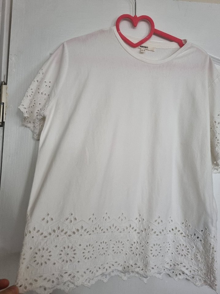 Kısa kollu, yuvarlak yakalı, pamuklu, bol kesim beyaz bluz. Kol ve etek uçlarında nakışlı dantel detayları bulunur. Günlük kullanıma uygundur.