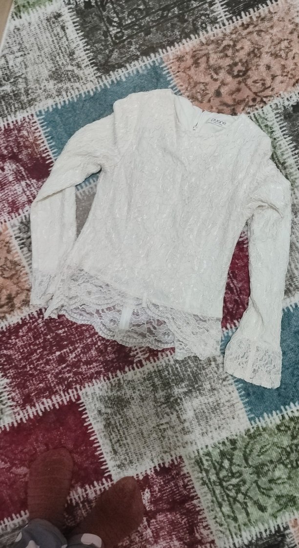 Uzun kollu, dantel detaylı ve nakışlı beyaz kadın bluz. Kayık yaka ve bol kesimiyle bohem tarzda, rahat ve günlük kullanıma uygun.
