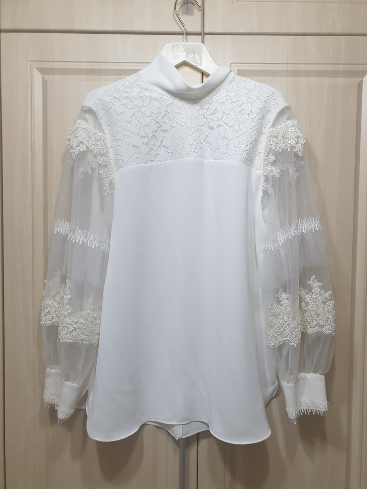 Yüksek yakalı, dantel işlemeli uzun kollu beyaz kadın bluz. Yumuşak triko kumaştan, bol kesim ve klasik şıklık için uygundur. Kolları tüldür