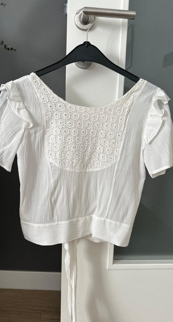 Beyaz, kısa kollu, dantel işlemeli ve kayık yaka kadın bluz. Pamuk kumaştan, bol kesim ve kısa boyda olup bohem tarzı yansıtır. Günlük kullanım için uygundur. Belden bağlama detayı vardır giyilmedi
