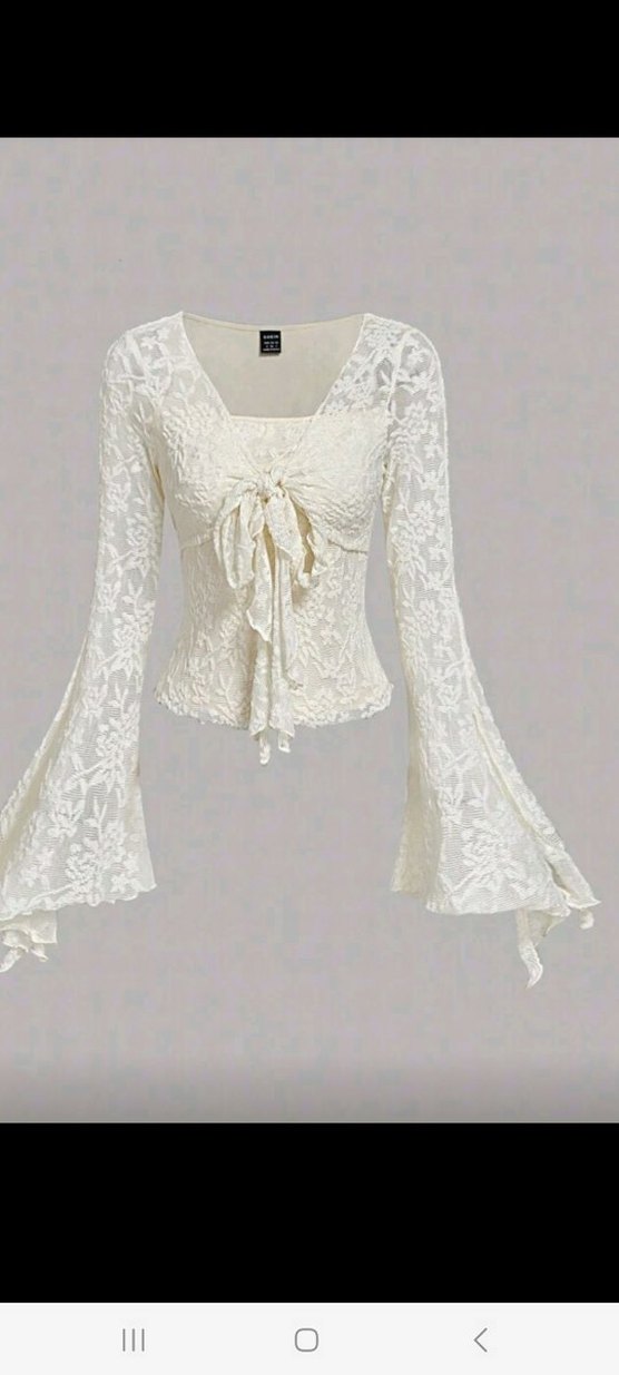 V yakalı, ön bağcıklı, dantel detaylı ve işlemeli beyaz, uzun kollu kadın bluz, bohem tarz için uygun.